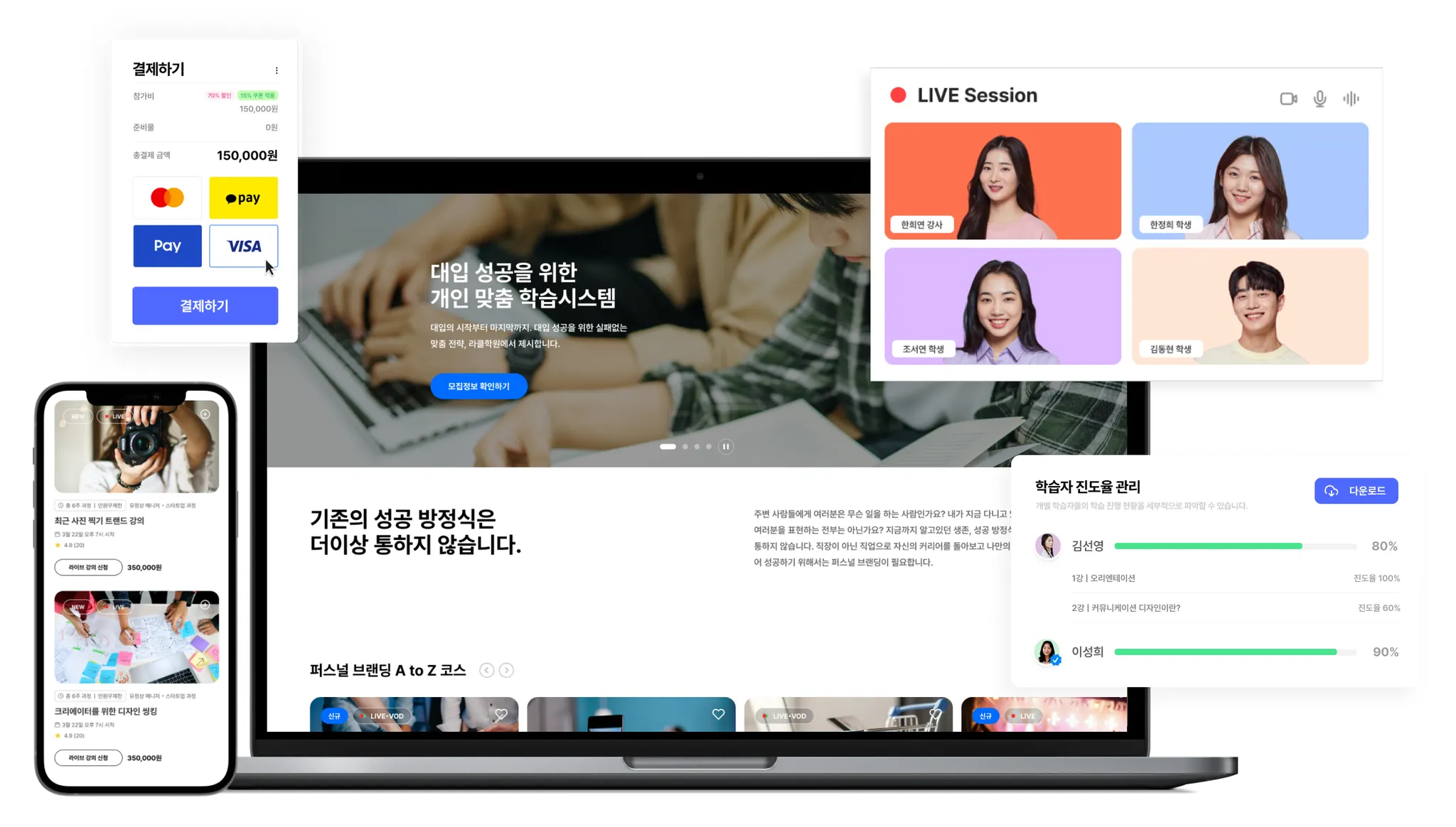 라이브클래스 하나면 추가 비용 없이도 PC, 태블릿, 핸드폰 등 다양한 디바이스에 맞게 알아서 사이트가 구성됩니다.